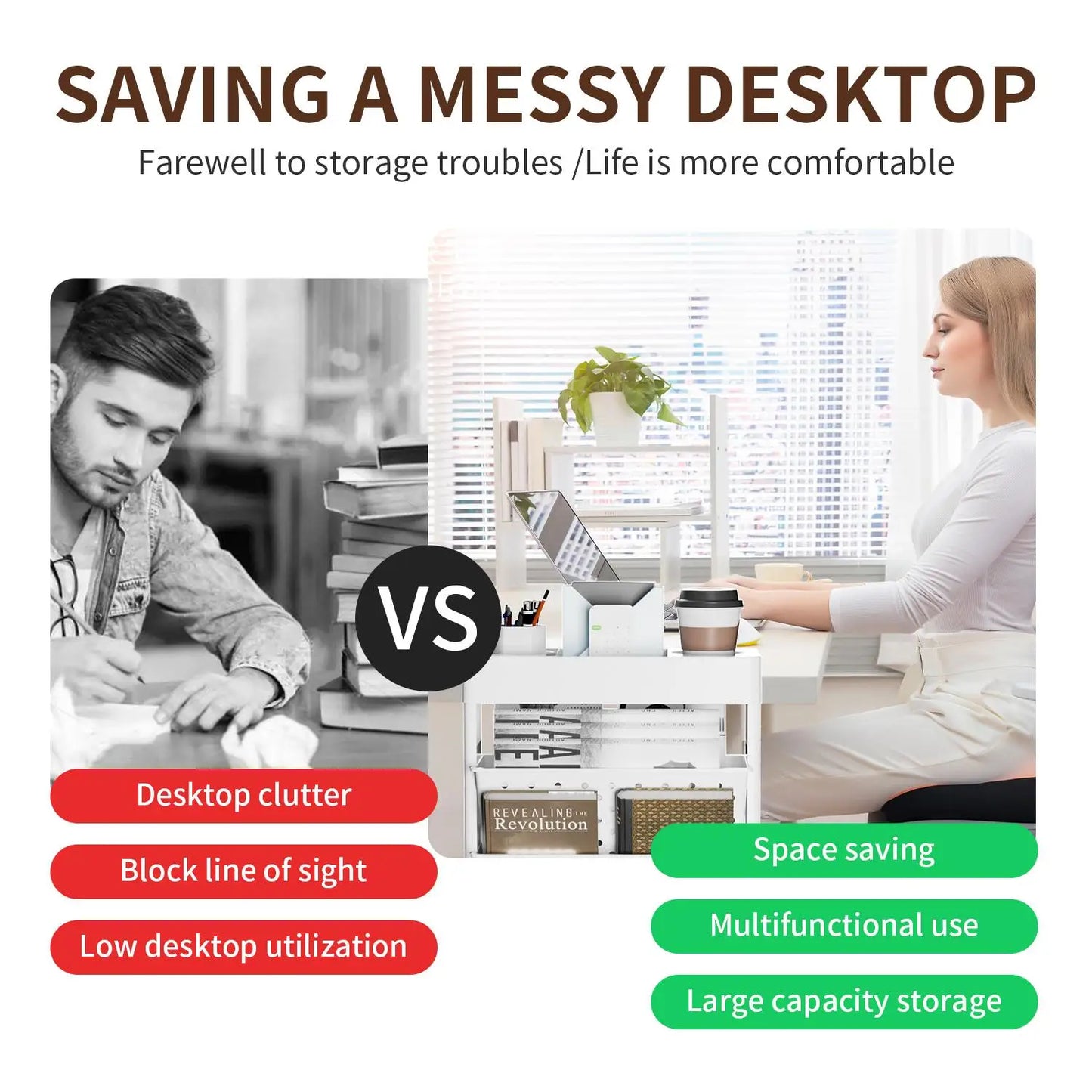 - ăMulti-tier Organizationă Our organizer book cart has 5 tiers of shelving baskets that provide plenty of storage space for all your necessities. Keep your pens, water cup, and small utilities on the top shelf and all your magazines, notes, envelopes, books, files, documents, bills, and papers on the other 4 shelves.
