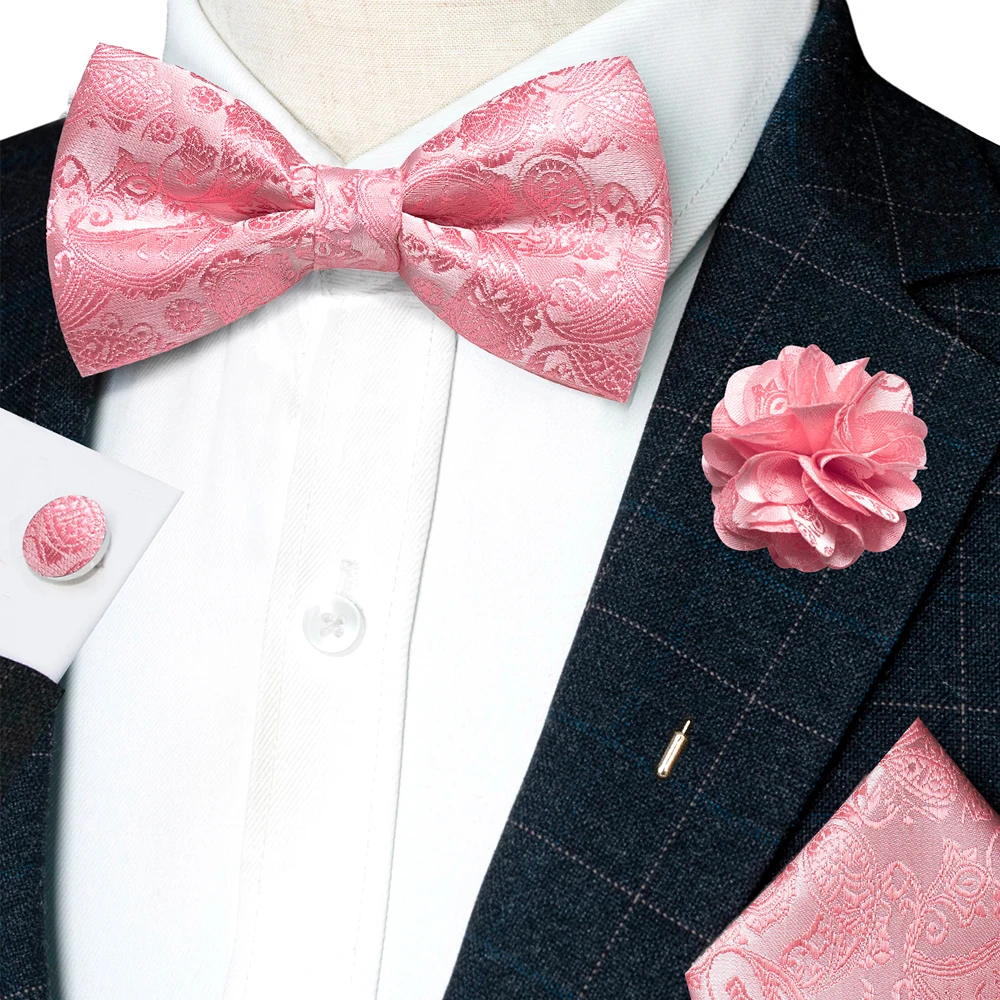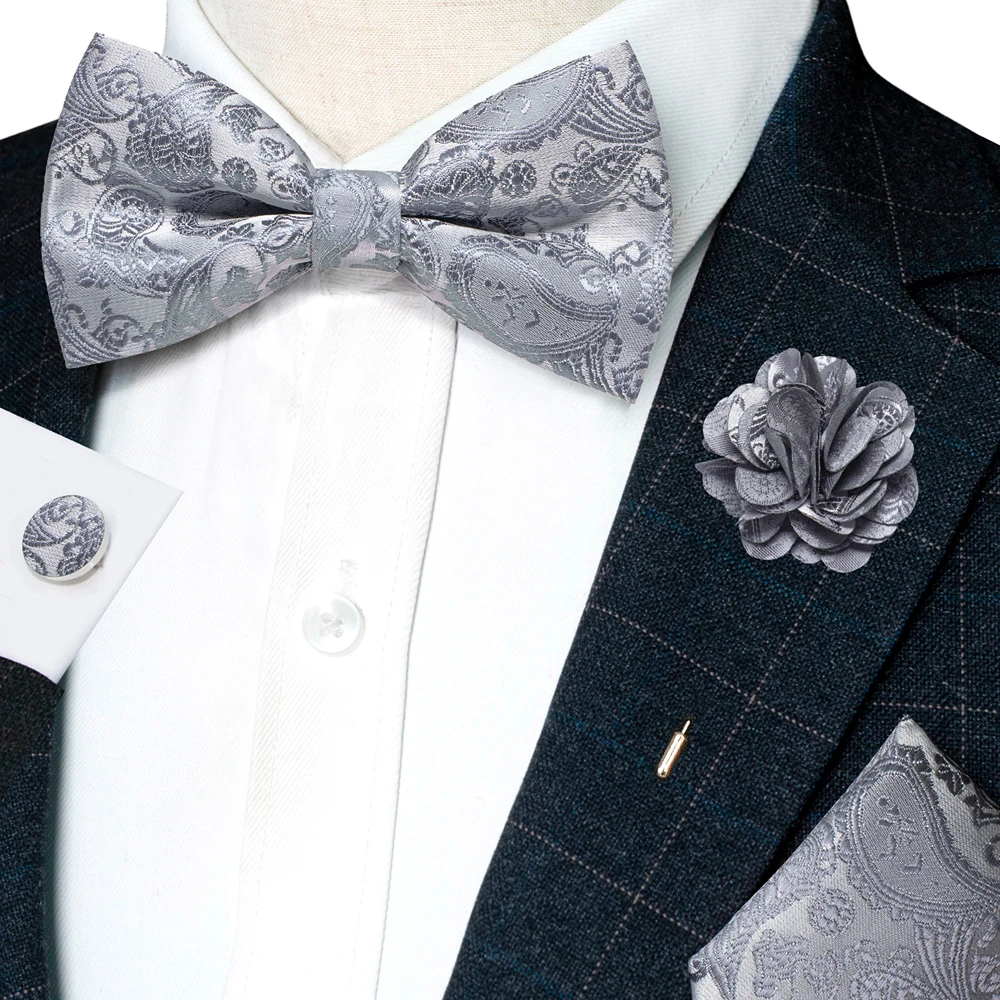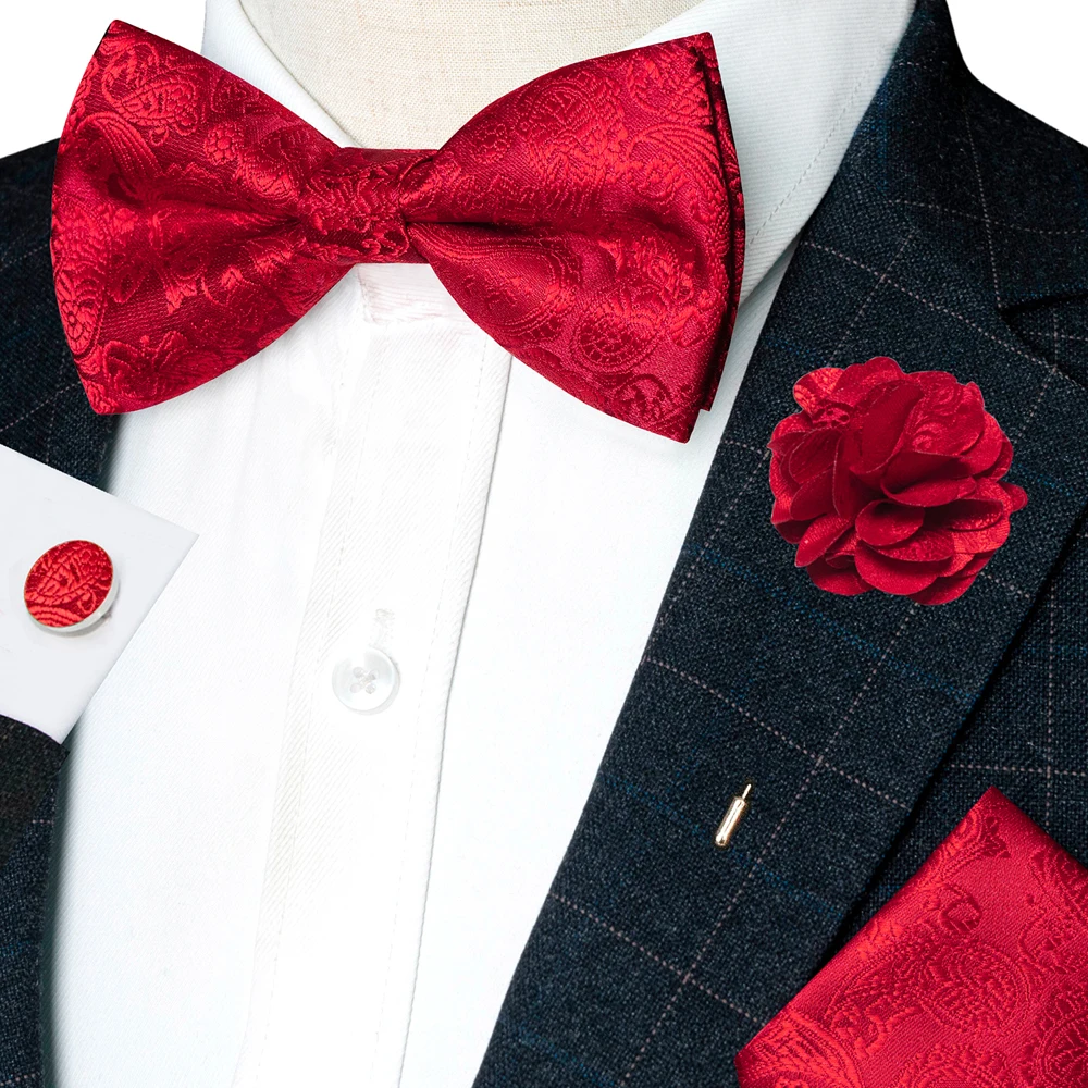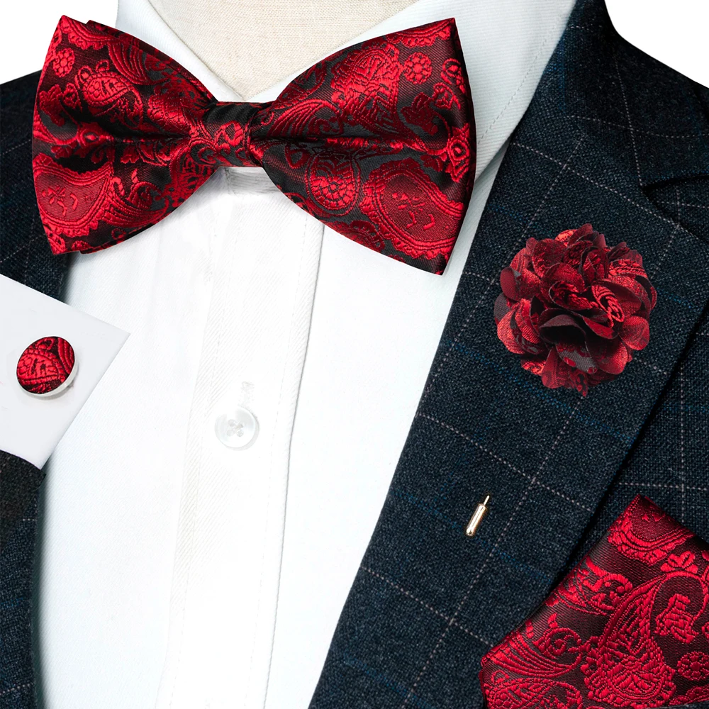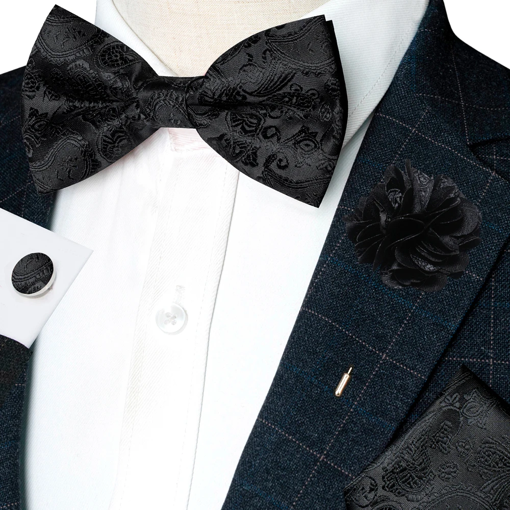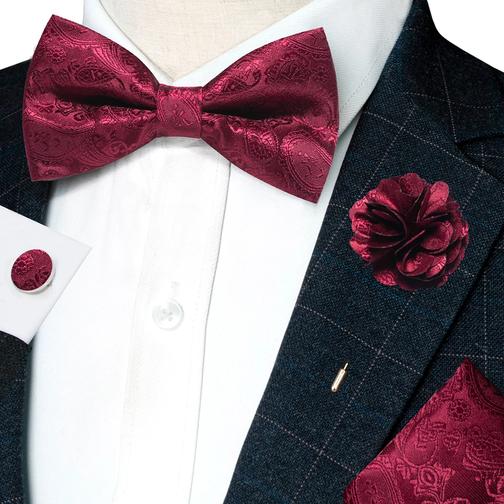 Mens Silk Bow Tie - Pre Tied Paisley Bow Tie Set With Brooch, Hanky & Cufflinks