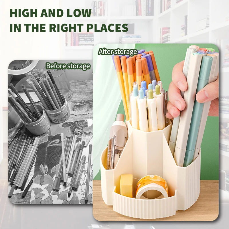 1.360-Degree Rotation: This pencil pen holder spins a full 360 degrees allowing unobstructed access to your stationary from any angle. Effortlessly rotate the caddy to reach for your desired items, keeping your desk clutter-free and enhancing your productivity.