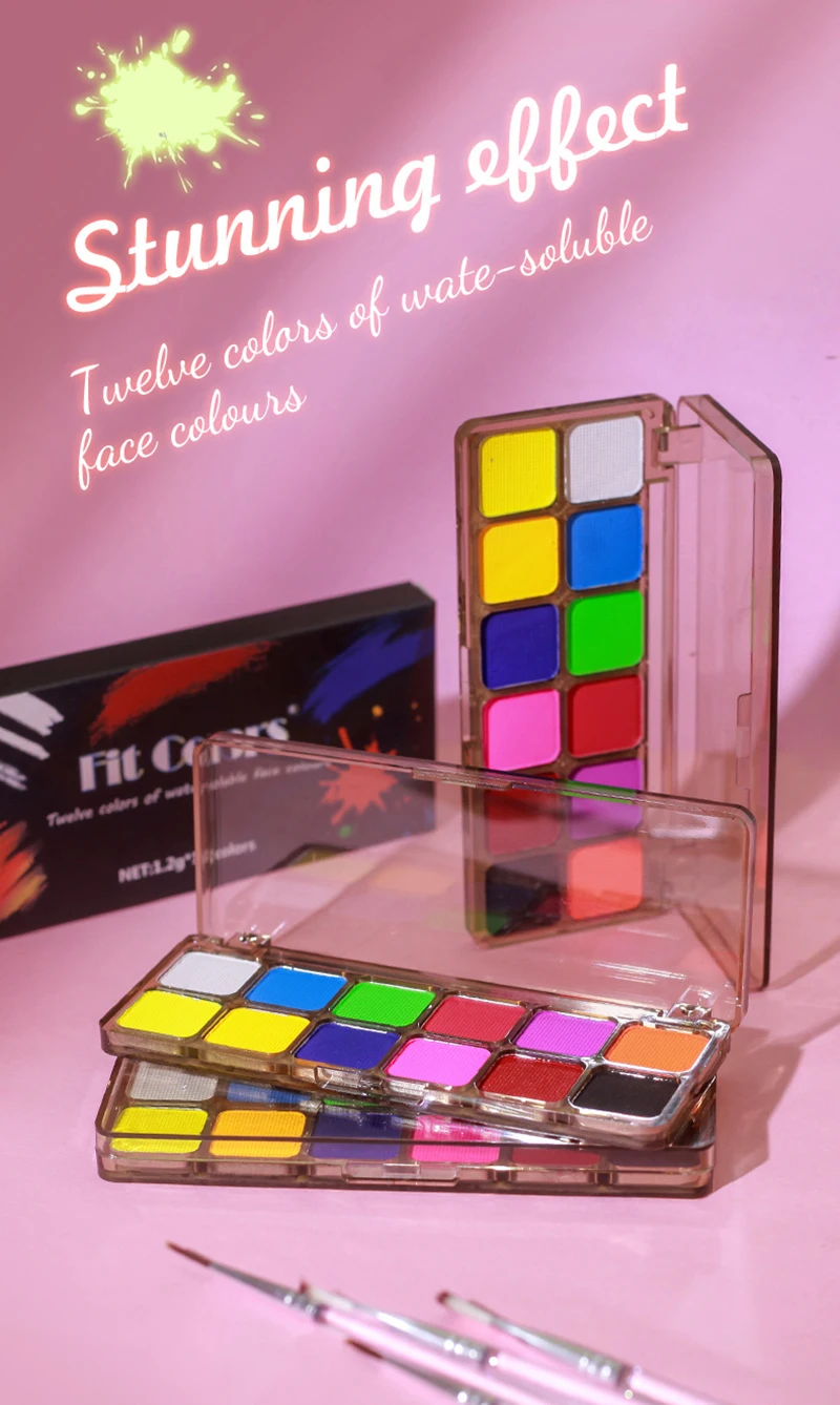 Ā· 01#:12 colors, cream, rich color, high chroma, soft and delicate. 02# : 12 colors, powder, water soluble, with brush, of which 6 colors with fluorescence.