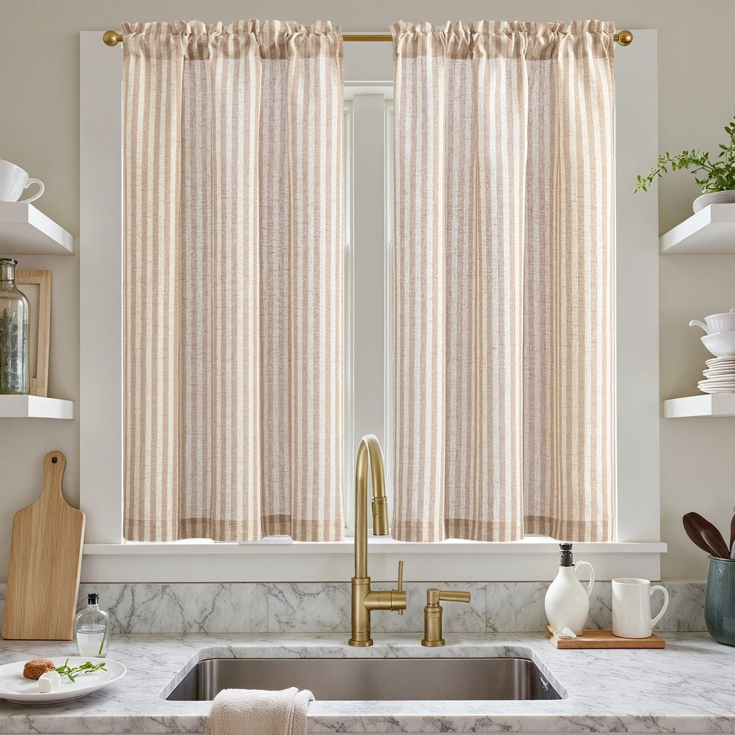 Linen Kitchen Curtains - Japanese Striped Short Rod Pocket Drapes