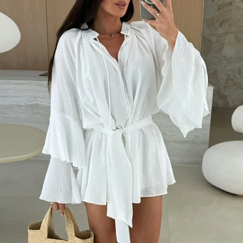 Loose Mini Dress - Casual Flare Sleeve Ruffle Summer Dress With Deep V-Neck