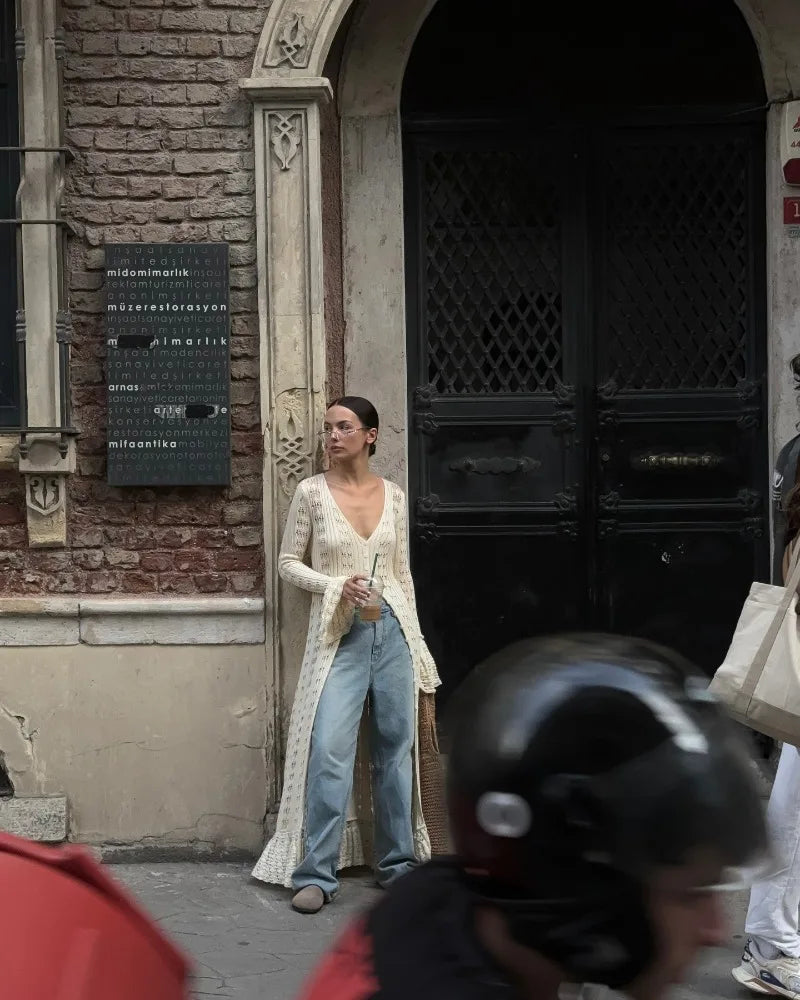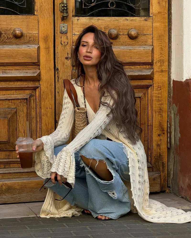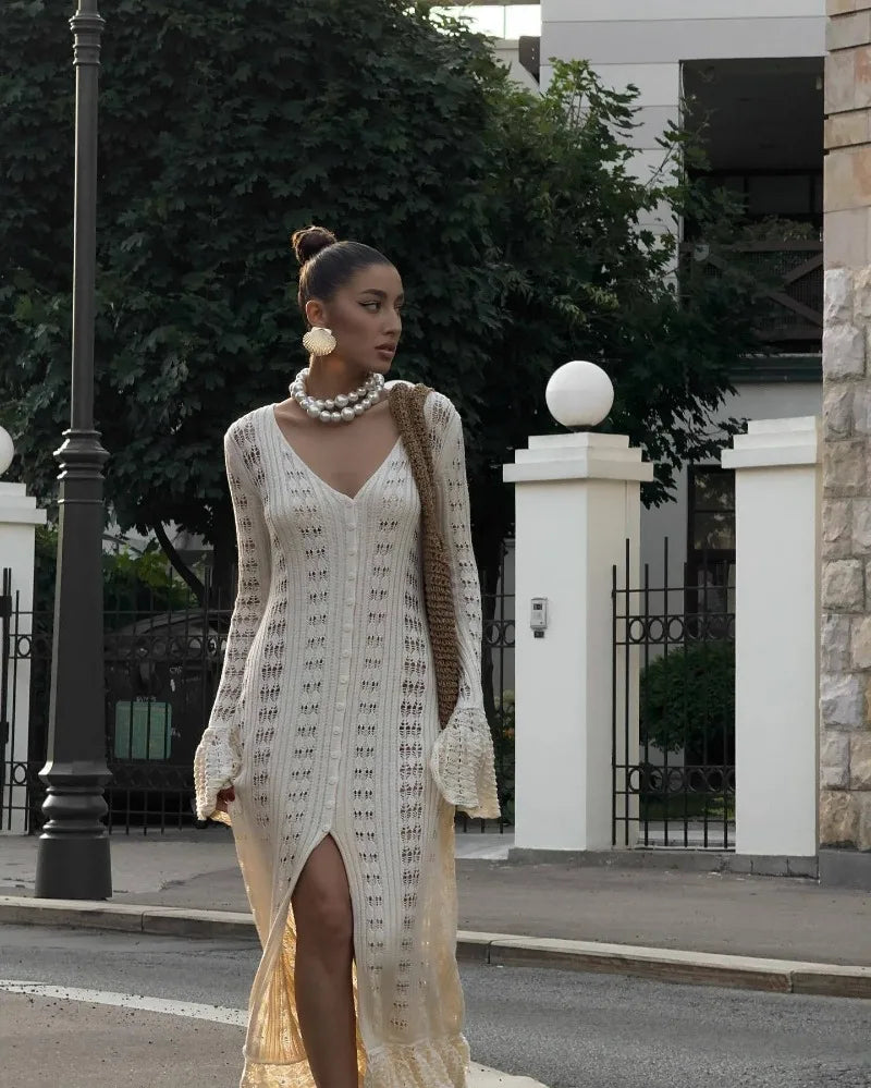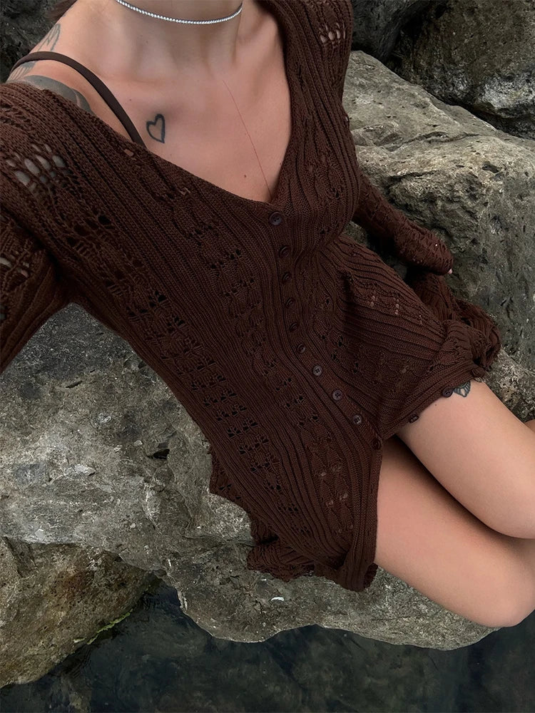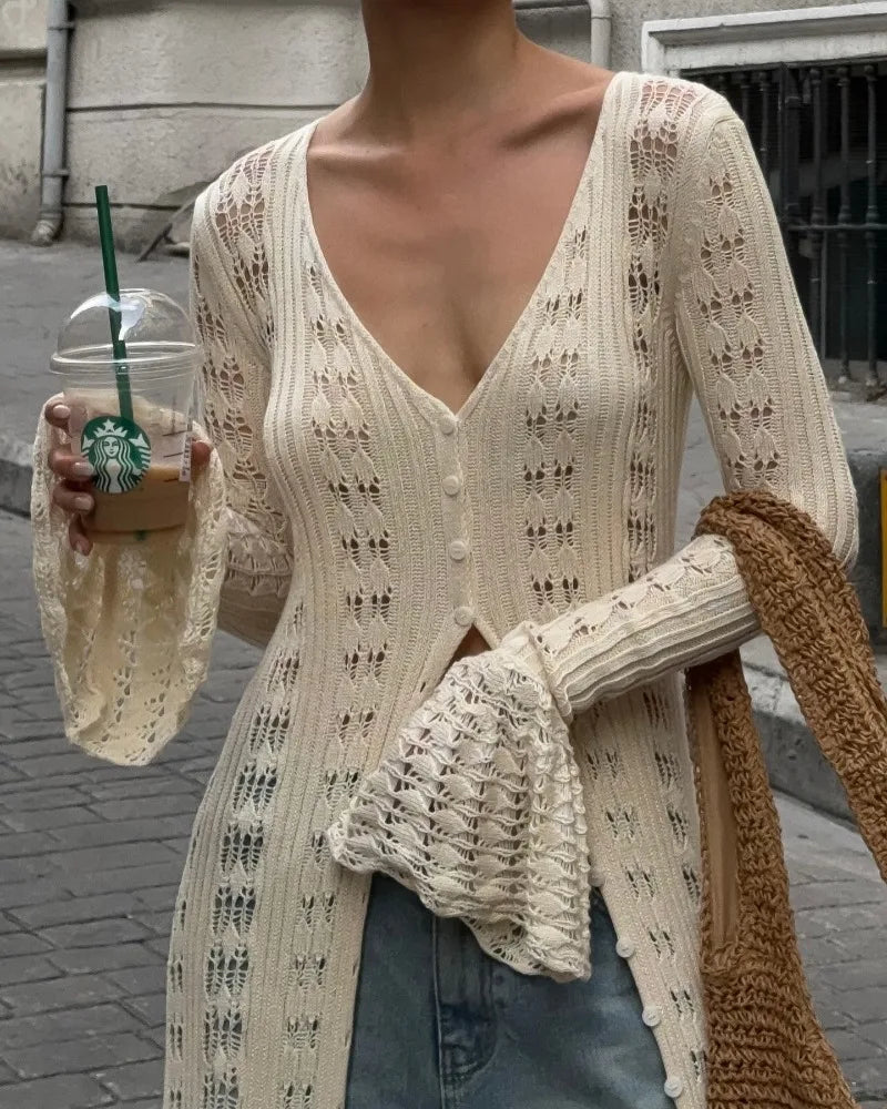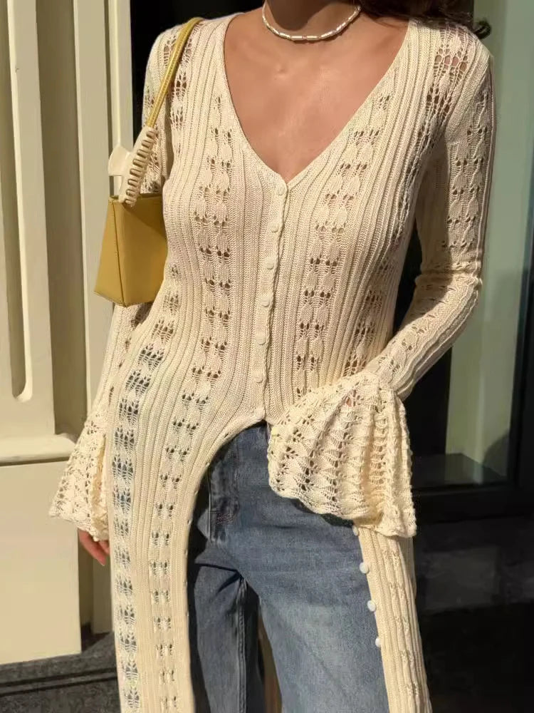 Deep V Neck Long Cardigan Dress - Elegant Hollow Knit Cover Up for Women