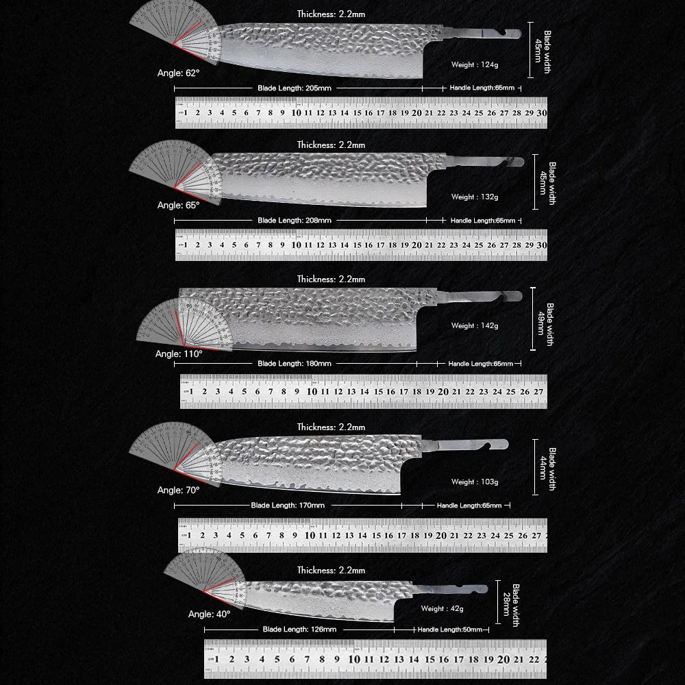 Knife Type: Chef Knives,10.5 inch Slicing knife blade,10.5 inch Sashimi knife blade,9.5 inch Slicing knife blade,8.2 inch Kiritsuke knife blade,8 inch Chef knife blade,7 inch Santoku knife blade,7 inch Nakiri knife blade,5 inch Utility knife blade